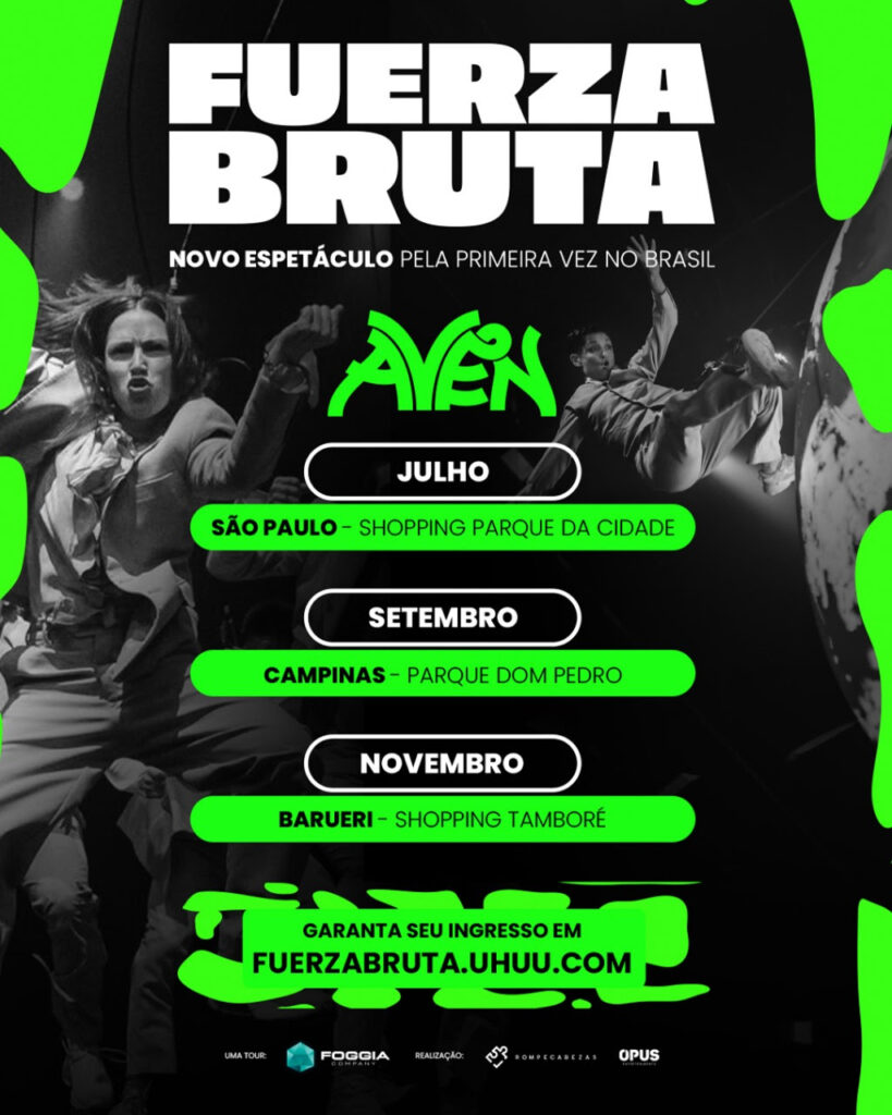 A companhia teatral Fuerza Bruta, reconhecida mundialmente por suas performances dinâmicas e inovadoras, está em sua segunda semana em cartaz com o novo espetáculo “AVEN” no Shopping Parque da Cidade, em São Paulo. O show tem atraído um público diversificado e de todas as idades, proporcionando uma experiência multissensorial e inesquecível.